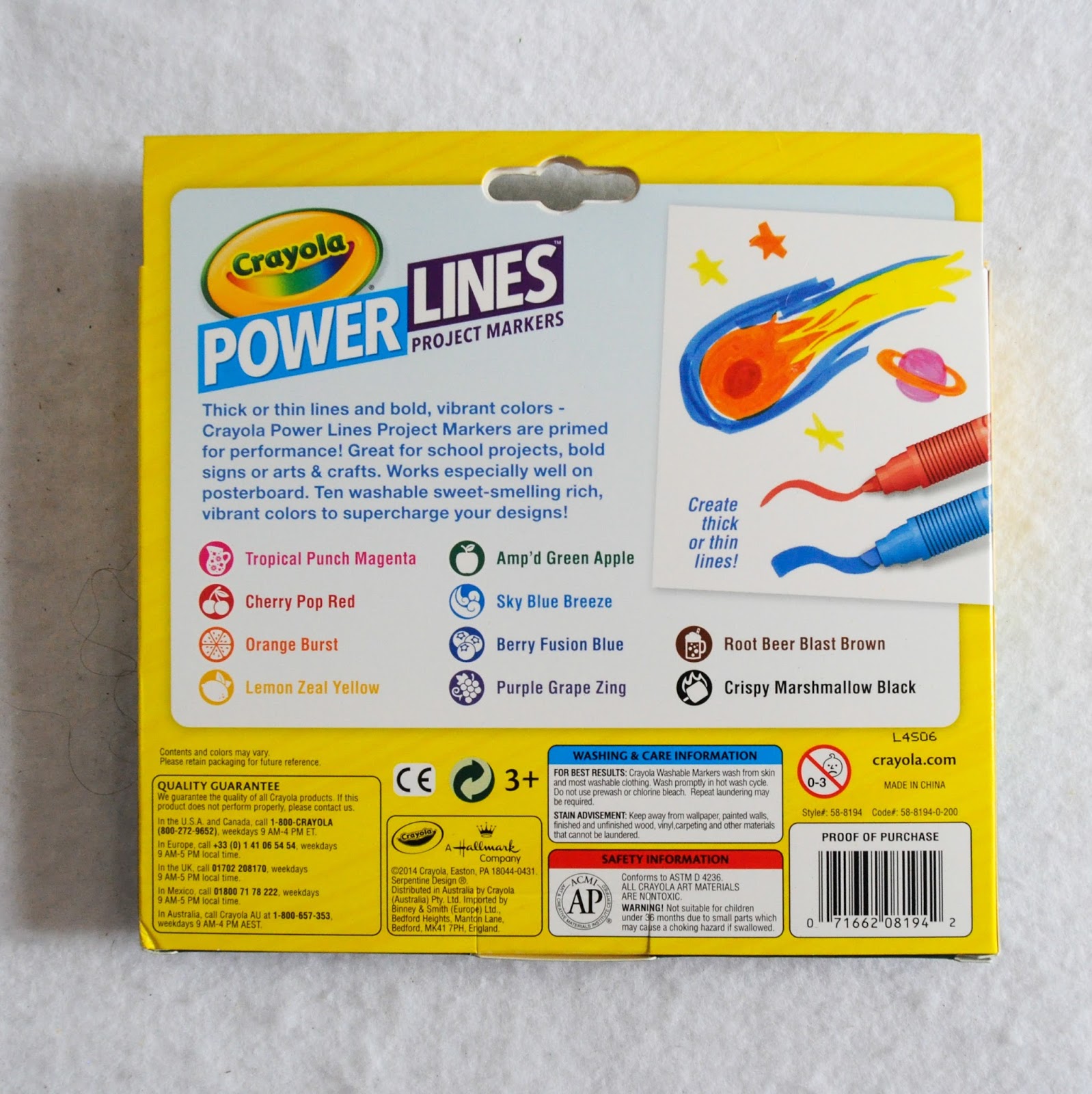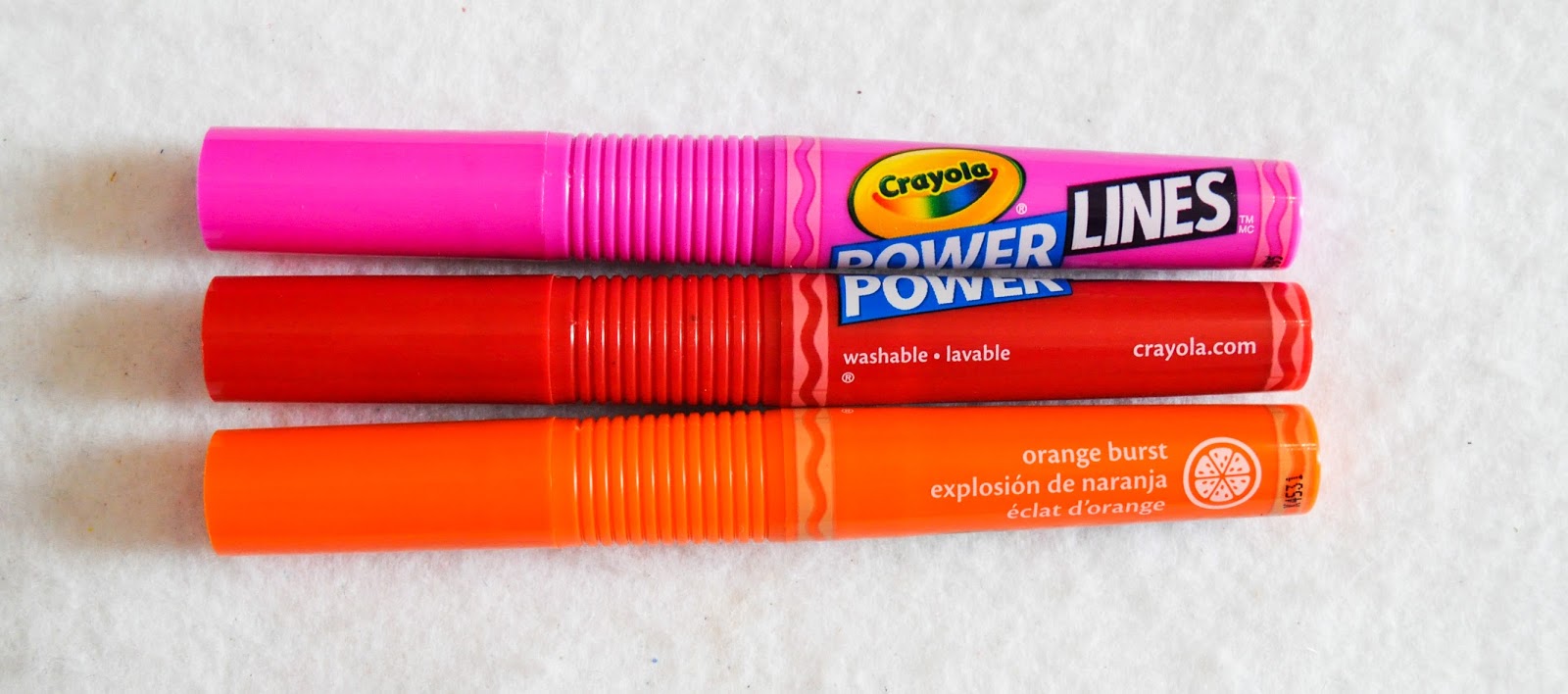 The Crayola Power Lines Scented Project Markers can draw very thick lines, but they can be used to draw thin lines too. Even though it is not emphasized on the front of the package these markers are washable. And to add to it they are scented too! Double win. I really hope that this means Crayola is making it's way back into the scented market and some scented crayons appear soon.
