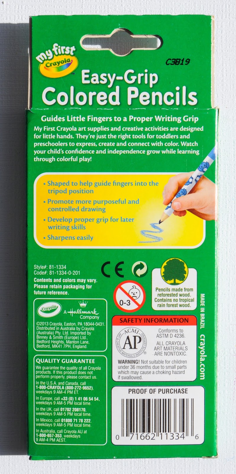 I found the My First Crayola Easy-Grip colored pencils at the store and loved them. I have a couple other "my first" Crayola items and love them too. I especially love the egg looking crayons. I do not have any yet, but they are on my wish list of things to get. These pencils are triangular shaped and have pictures of animals on them. They are similar to the Write Start colored pencils, but those are not triangular, they employ the use of hexagons for their easy grip shape.