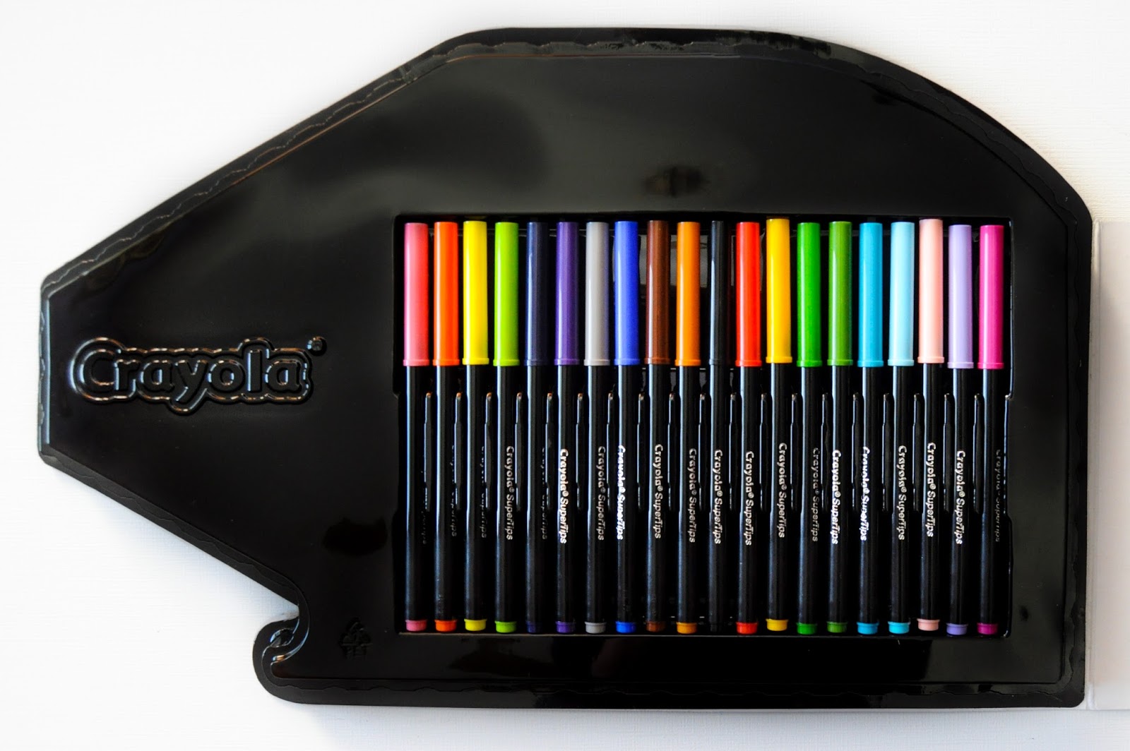 What's inside the box: 20 Super Tips Markers-not named, 8 Long Colored Pencils-red, orange, yellow, green, blue, violet (purple), black, brown, 5 Short Colored Pencils-not named, 8 Twistables Crayons, 8 Metallic Markers-Pink Bling, Purple Steel, Cobalt Blue, Green Machine, Gold Ingot, Copper Mine, Black Iron, Slick Silver, 1 Pencil Sharpener, 8 Coloring Pages, 1 Origami Millennium Falcon, 15 Blank Paper Sheets