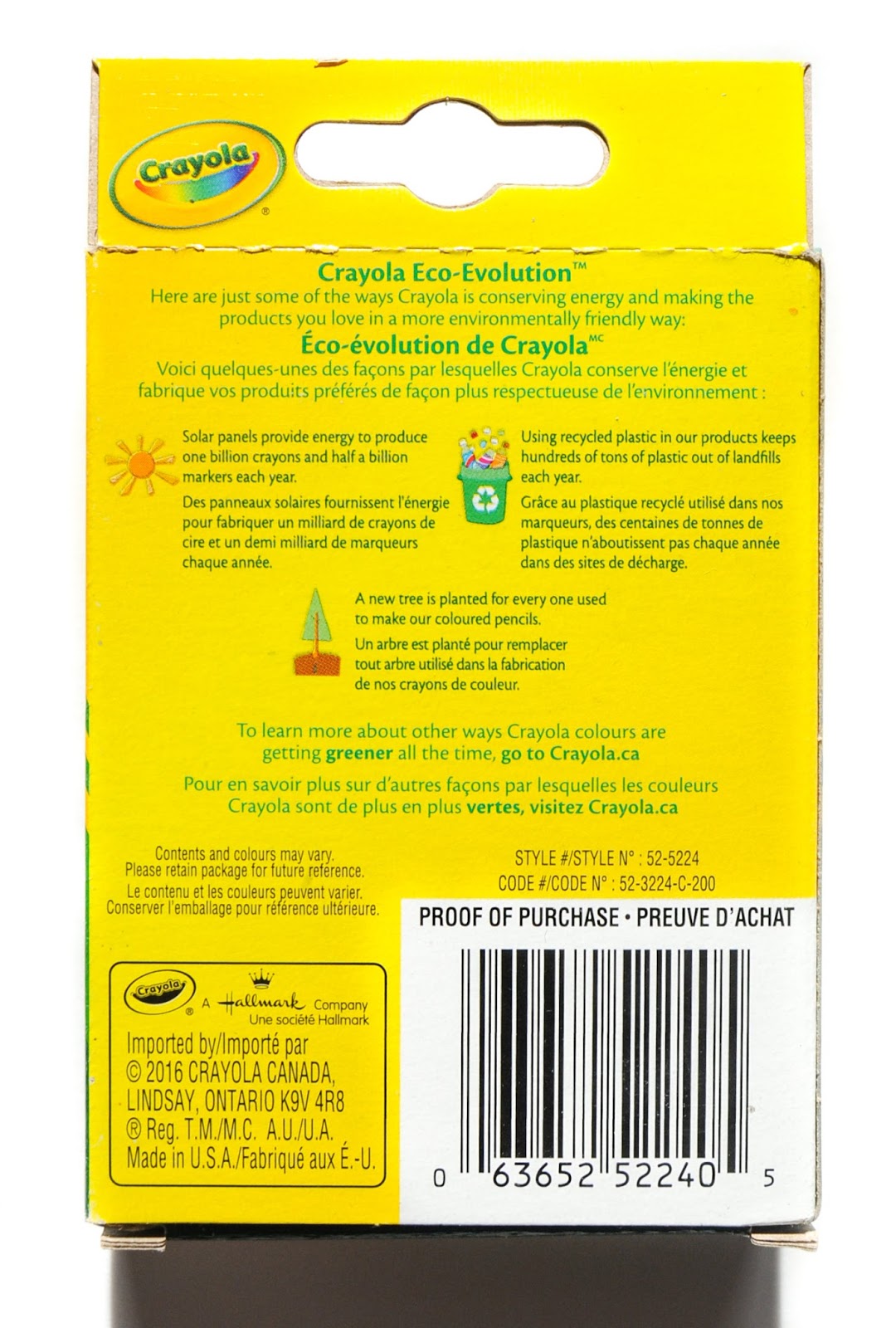 The Canadian box is in celebration of 25 years of Staples in Canada. For this promotion Staples ran a contest flying people to the Staples Center in Los Angeles and awarding them with money. I love how Crayola works with companies to promote special events. I know there is a Target box out there somewhere that I would love to get my hands on. The 24 is in silver lettering. There is nothing on the back that is any different for the celebration.